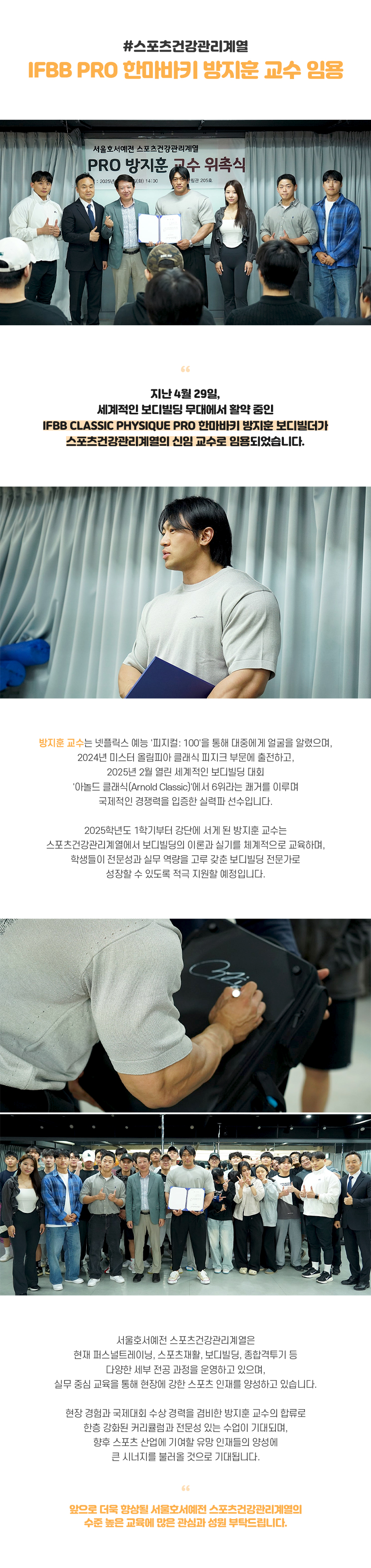 지난 4월 29일, 세계적인 보디빌딩 무대에서 활약 중인 IFBB CLASSIC PHYSIQUE PRO 한마바키 방지훈 보디빌더가 스포츠건강관리계열의 신임 교수로 임용되었습니다. 방지훈 교수는 넷플릭스 예능 '피지컬: 100'을 통해 대중에게 얼굴을 알렸으며, 2024년 미스터 올림피아 클래식 피지크 부문에 출전하고, 2025년 2월 열린 세계적인 보디빌딩 대회 '아놀드 클래식(Arnold Classic)'에서 6위라는 쾌거를 이루며 국제적인 경쟁력을 입증한 실력파 선수입니다.