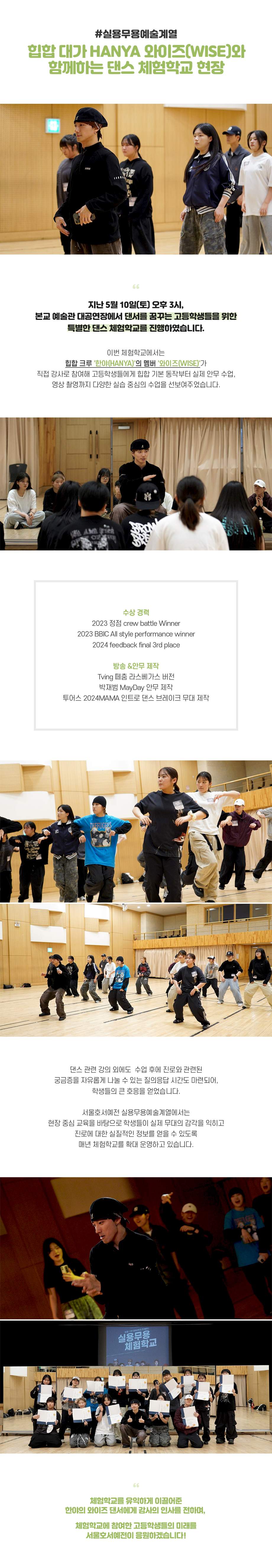 지난 5월 10일 토요일, 본교 예술관 대공연장에서 댄서를 꿈꾸는 고등학생들을 위한 특별한 댄스 체험학교를 진행하였습니다. 이번 체험학교에서는 힙합 크루 '한야(HANYA)'의 멤버 '와이즈(WISE)'가 직접 강사로 참여해 고등학생들에게 힙합 기본 동작부터 실제 안무 수업, 영상 촬영까지 다양한 실습 중심의 수업을 선보여주었습니다.
