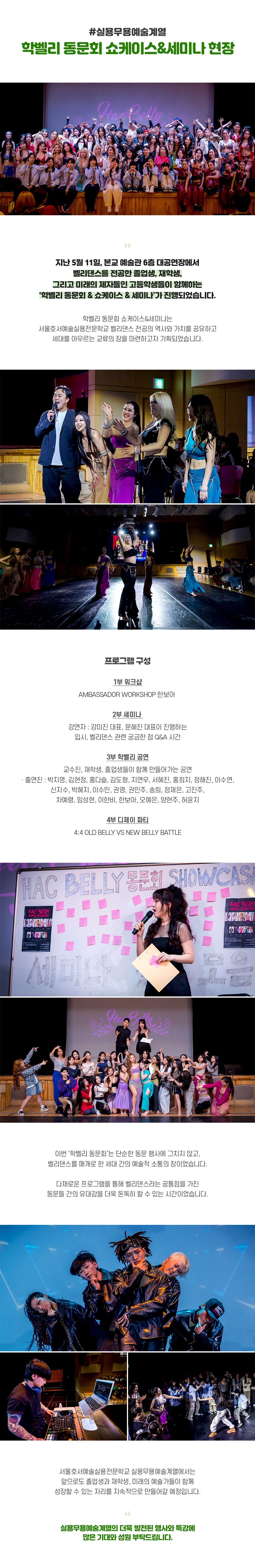 지난 5월 11일, 본교 예술관 6층 대공연장에서 벨리댄스를 전공한 졸업생, 재학생, 그리고 미래의 제자들인 고등학생들이 함께하는 ‘학벨리 동문회 & 쇼케이스 & 세미나’가 진행되었습니다. 학벨리 동문회 쇼케이스&세미나는 호서예전 벨리댄스 전공의 역사와 가치를 공유하고 세대를 아우르는 교류의 장을 마련하고자 기획되었습니다.
