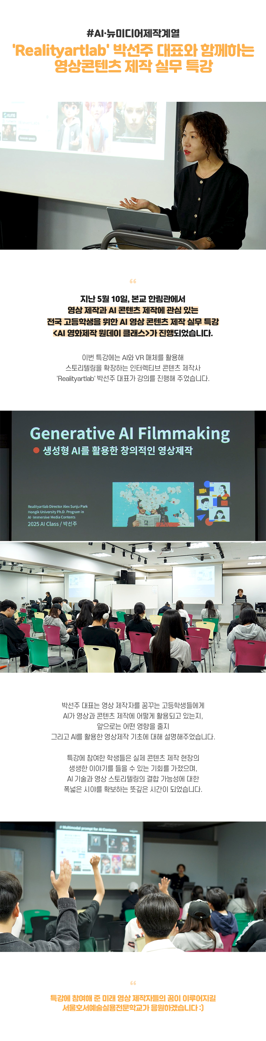 지난 5월 10일, 서울호서예술실용전문학교 한림관에서 영상 제작과 AI 콘텐츠 제작에 관심 있는 전국 고등학생을 위한 AI 영상 콘텐츠 제작 실무 특강 <AI 영화제작 원데이 클래스>를 진행되었습니다. 이번 특강에는 AI와 VR 매체를 활용해 스토리텔링을 확장하는 인터렉티브 콘텐츠 제작사 'Realityartlab' 박선주 대표가 강의를 진행해 주었습니다.