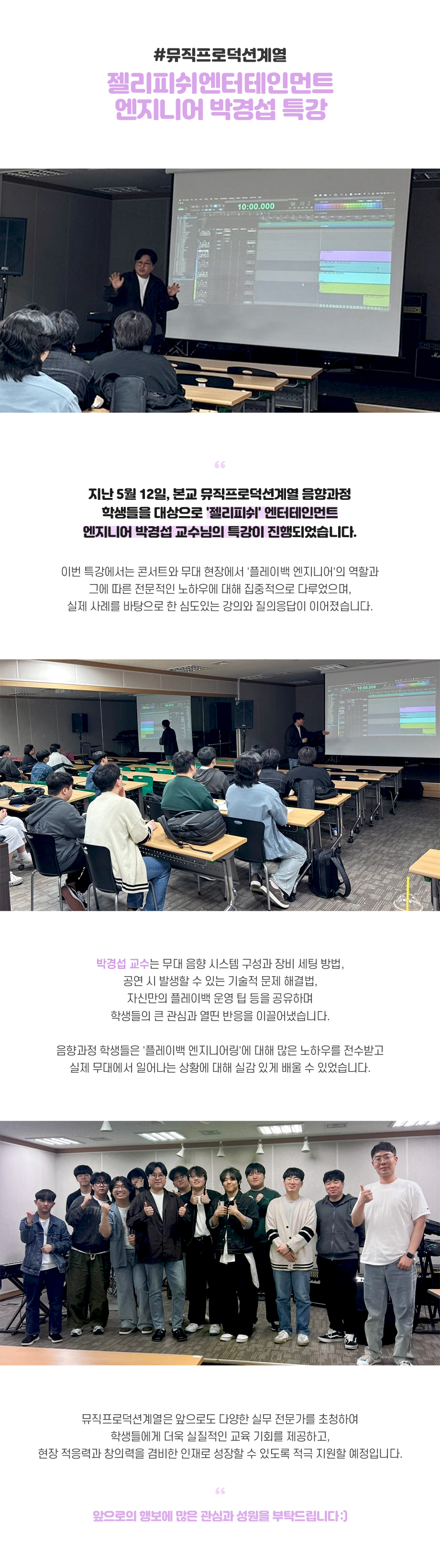 지난 5월 12일, 뮤직프로덕션계열 음향과정 학생들을 대상으로 '젤리피쉬' 엔터테인먼트 엔지니어 박경섭 교수님의 특강이 진행되었습니다. 이번 특강에서는 콘서트와 무대 현장에서 '플레이백 엔지니어'의 역할과 그에 따른 전문적인 노하우에 대해 집중적으로 다루었으며, 실제 사례를 바탕으로 한 심도있는 강의와 질의응답이 이어졌습니다.