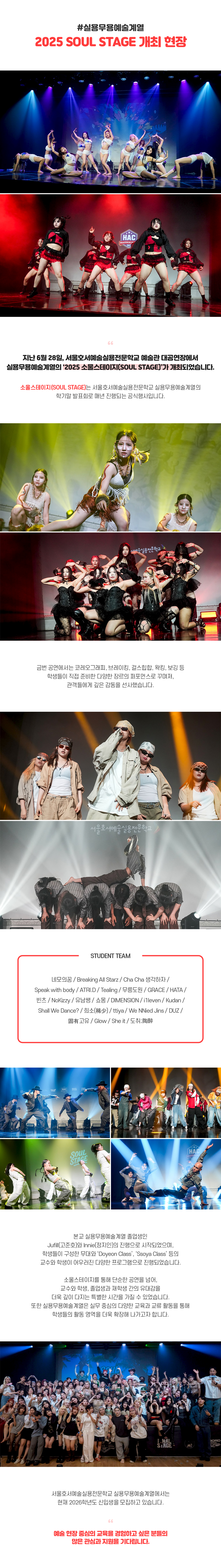 지난 6월 28일, 서울호서예술실용전문학교 예술관 대공연장에서 실용무용예술계열의 ‘2025 소울스테이지(SOUL STAGE)’가 개최되었습니다. 소울스테이지(SOUL STAGE)는 서울호서예술실용전문학교 실용무용예술계열의 학기말 발표회로 매년 진행되는 공식행사입니다.