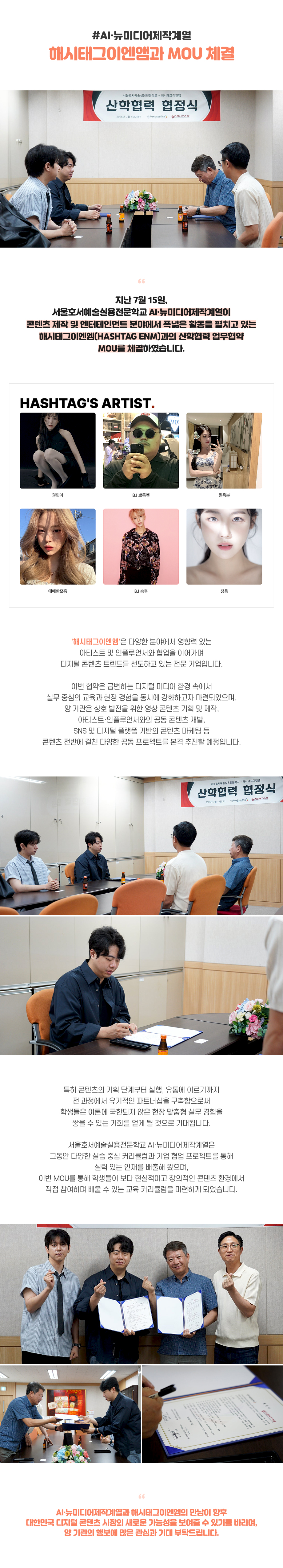 지난 7월 15일, 서울호서예술실용전문학교 AI·뉴미디어제작계열이 콘텐츠 제작 및 엔터테인먼트 분야에서 폭넓은 활동을 펼치고 있는 해시태그이엔엠(HASHTAG ENM)과의 산학협력 업무협약 MOU를 체결하였습니다. '해시태그이엔엠'은 다양한 분야에서 영향력 있는 아티스트 및 인플루언서와 협업을 이어가며 디지털 콘텐츠 트렌드를 선도하고 있는 전문 기업입니다.