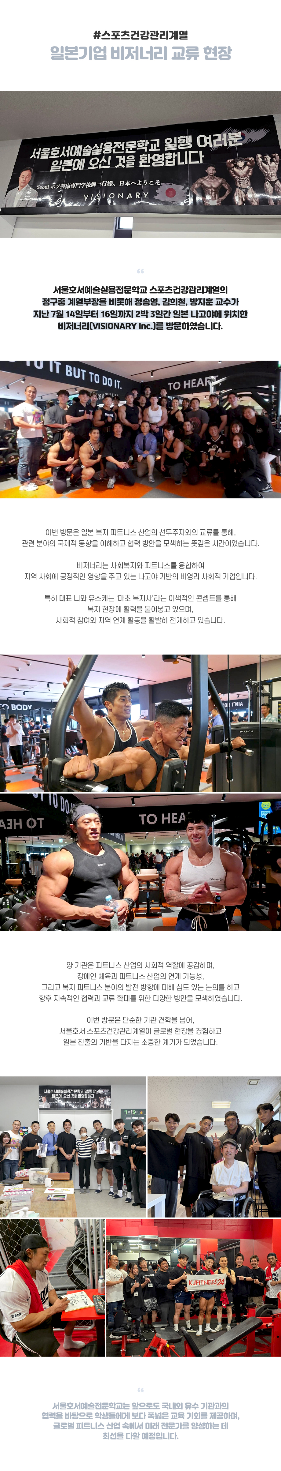 서울호서예술실용전문학교 스포츠건강관리계열의 정구중 계열부장을 비롯해 정송영, 김희철, 방지훈 교수가 지난 7월 14일부터 16일까지 2박 3일간 일본 나고야에 위치한 비저너리(VISIONARY Inc.)를 방문하였습니다. 이번 방문은 일본 복지 피트니스 산업의 선두주자와의 교류를 통해, 관련 분야의 국제적 동향을 이해하고 협력 방안을 모색하는 뜻깊은 시간이었습니다.