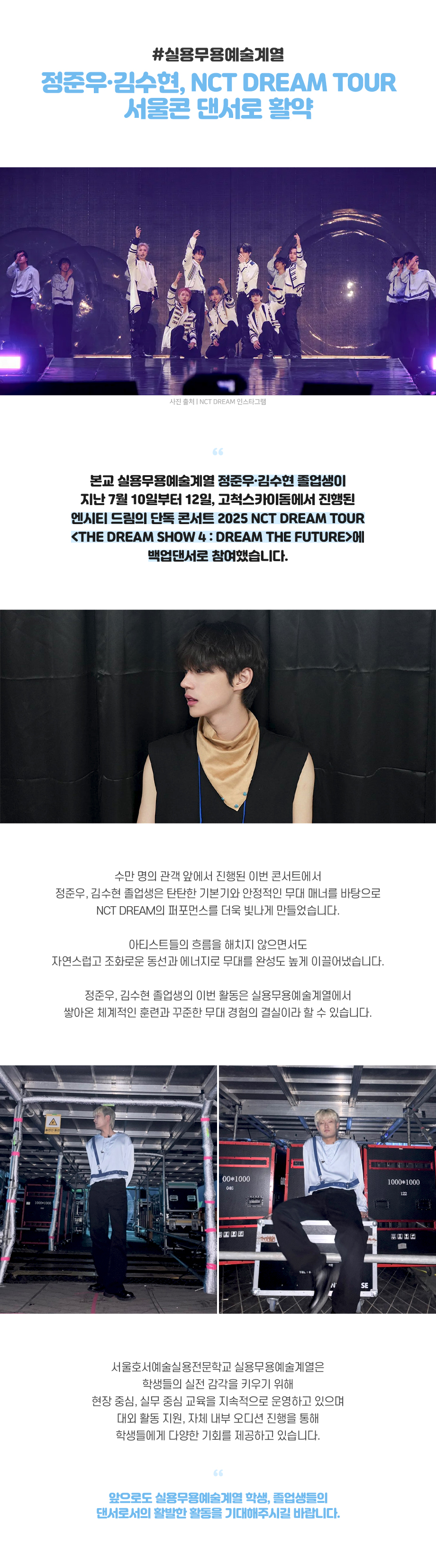 본교 실용무용예술계열 정준우 김수현 졸업생이 지난 7월 10일부터 12일 고척스카이돔에서 진행된 엔시티 드림의 단독 콘서트 2025 NCT DREAM TOUR <THE DREAM SHOW 4 : DREAM THE FUTURE>에 백업댄서로 참여했습니다. ?수만 명의 관객 앞에서 진행된 이번 콘서트에서 정준우, 김수현 졸업생은 탄탄한 기본기와 안정적인 무대 매너를 바탕으로 NCT DREAM의 퍼포먼스를 더욱 빛나게 만들었습니다.