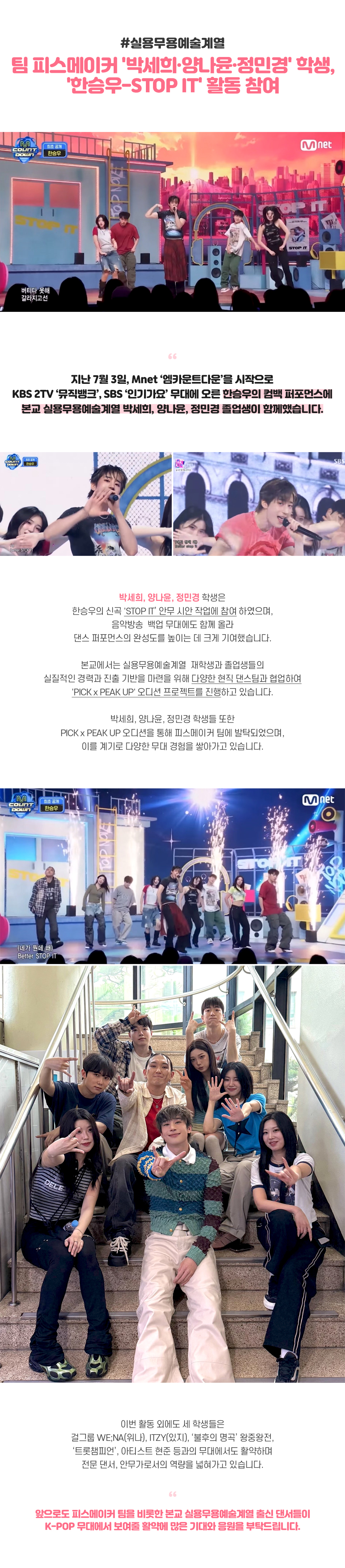 지난 7월 3일, Mnet ‘엠카운트다운’을 시작으로 KBS 2TV ‘뮤직뱅크’, SBS ‘인기가요’ 무대에 오른 한승우의 컴백 퍼포먼스에 본교 실용무용예술계열 박세희, 양나윤, 정민경 졸업생이 함께했습니다. 박세희, 양나윤, 정민경 학생은 한승우의 신곡 'STOP IT’ 안무 시안 작업에 참여 하였으며, 음악방송 백업 무대에도 함께 올라 댄스 퍼포먼스의 완성도를 높이는 데 크게 기여했습니다.