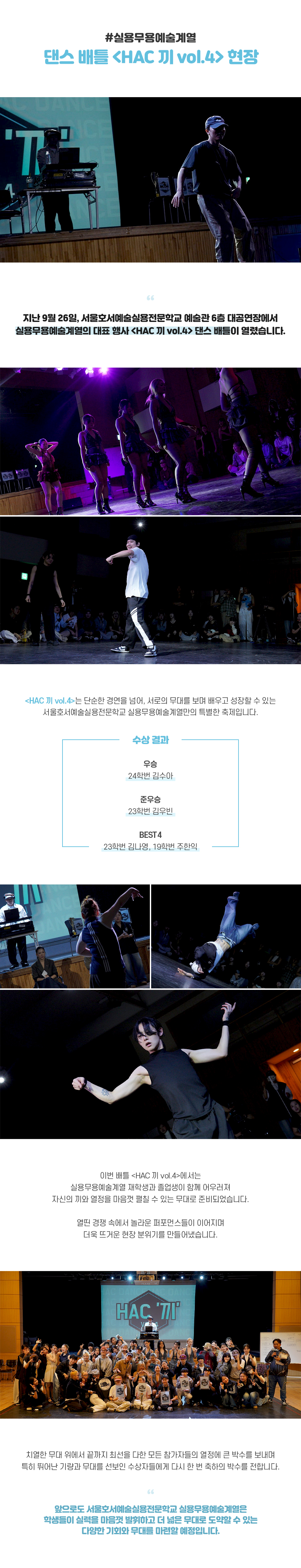 지난 9월 26일, 서울호서예술실용전문학교 예술관 6층 대공연장에서 실용무용예술계열의 대표 행사 hac vol.4 댄스 배틀이 열렸습니다. hac vol.4는 단순한 경연을 넘어, 서로의 무대를 보며 배우고 성장할 수 있는 서울호서예술실용전문학교 실용무용예술계열만의 특별한 축제입니다.