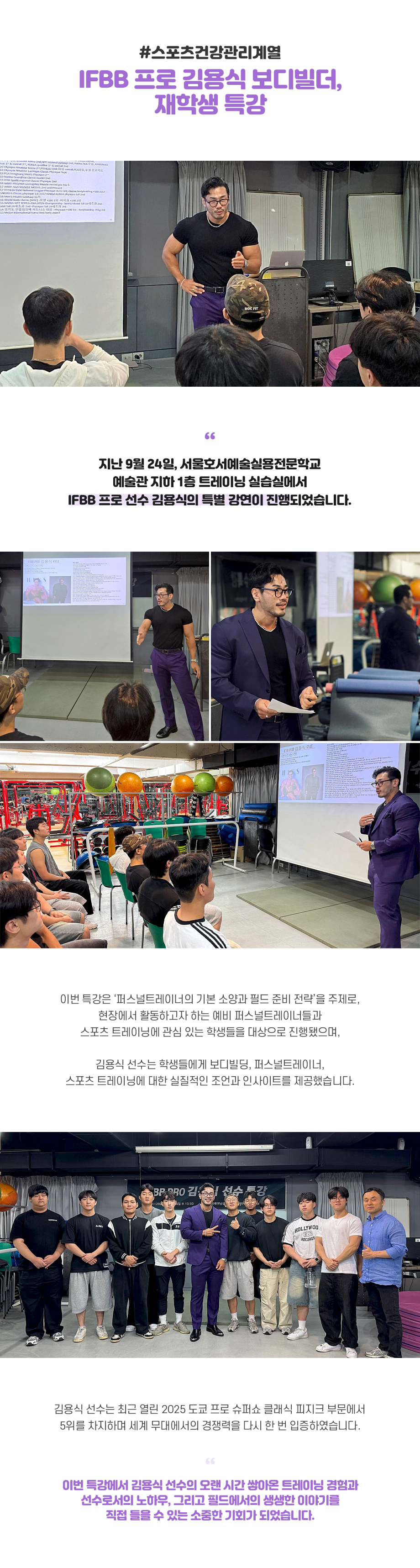 지난 9월 24일, 서울호서예술실용전문학교 예술관 지하 1층 트레이닝 실습실에서 IFBB 프로 선수 김용식의 특별 강연이 진행되었습니다. 이번 특강은 ‘퍼스널트레이너의 기본 소양과 필드 준비 전략’을 주제로, 현장에서 활동하고자 하는 예비 퍼스널트레이너들과 스포츠 트레이닝에 관심 있는 학생들을 대상으로 진행됐으며 김용식 선수는 학생들에게 보디빌딩, 퍼스널트레이너, 스포츠 트레이닝에 대한 실질적인 조언과 인사이트를 제공했습니다.