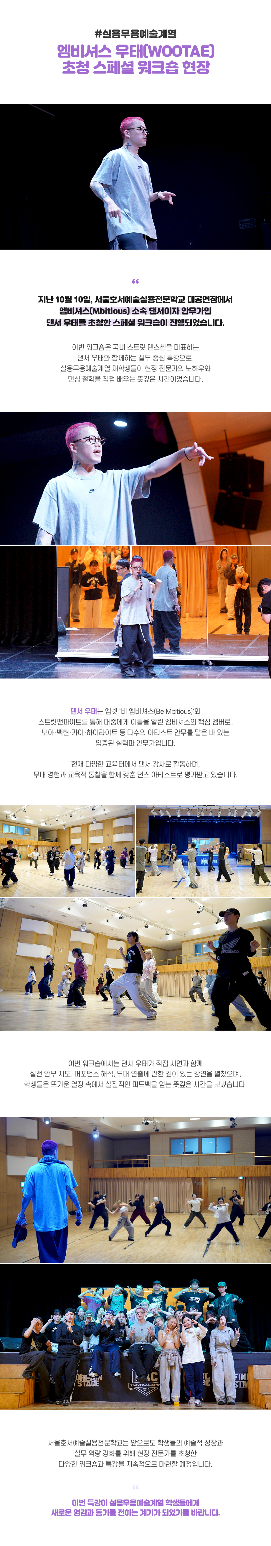 지난 10월 10일, 서울호서예술실용전문학교 예술관 6층 대공연장에서 엠비셔스(Mbitious) 소속 댄서이자 안무가인 댄서 우태를 초청한 스페셜 워크숍이 진행되었습니다.