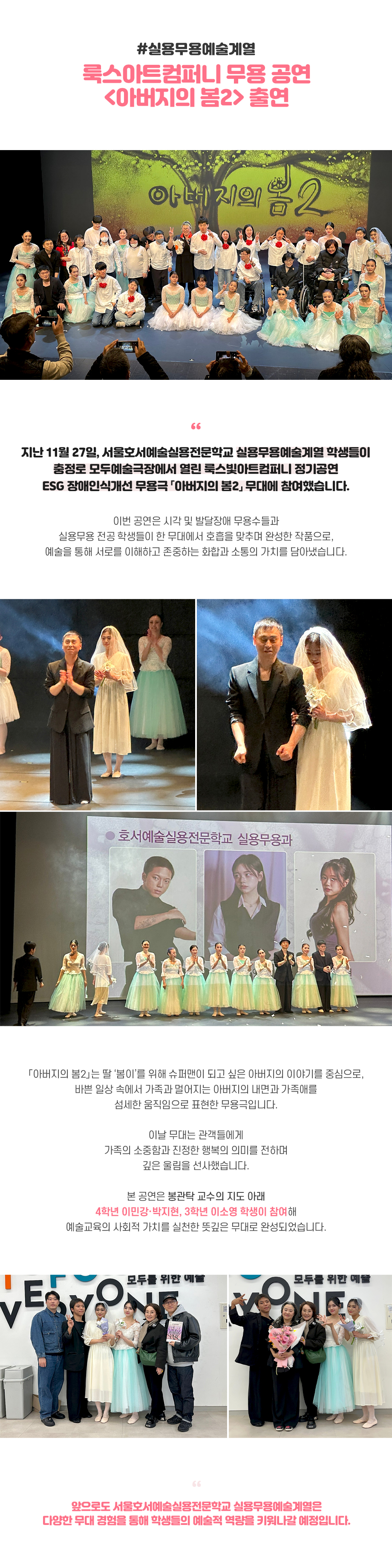 지난 11월 27일, 서울호서예술실용전문학교 실용무용예술계열 학생들이 충정로 모두예술극장에서 열린 룩스빛아트컴퍼니 정기공연 ESG 장애인식개선 무용극 「아버지의 봄2」 무대에 참여했습니다.