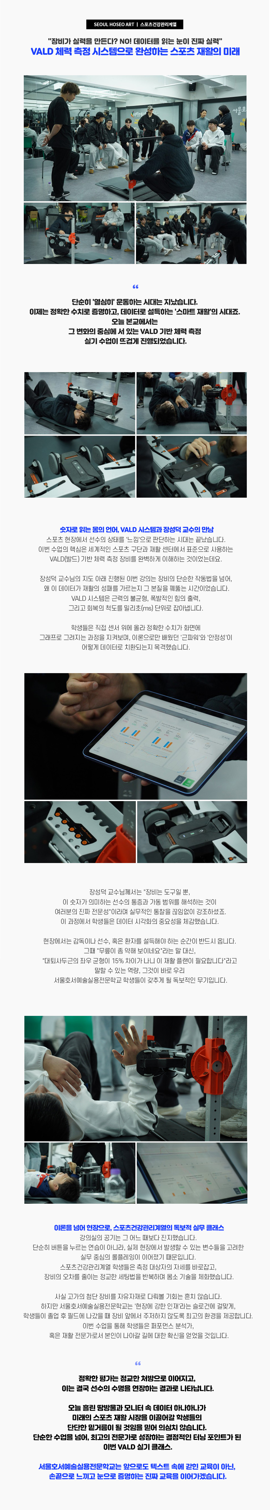 단순히 '열심히' 운동하는 시대는 지났습니다. 이제는 정확한 수치로 증명하고, 데이터로 설득하는 '스마트 재활'의 시대죠. 오늘 서울호서예술실용전문학교에서는 그 변화의 중심에 서 있는 VALD 기반 체력 측정 실기 수업이 뜨겁게 진행되었습니다.