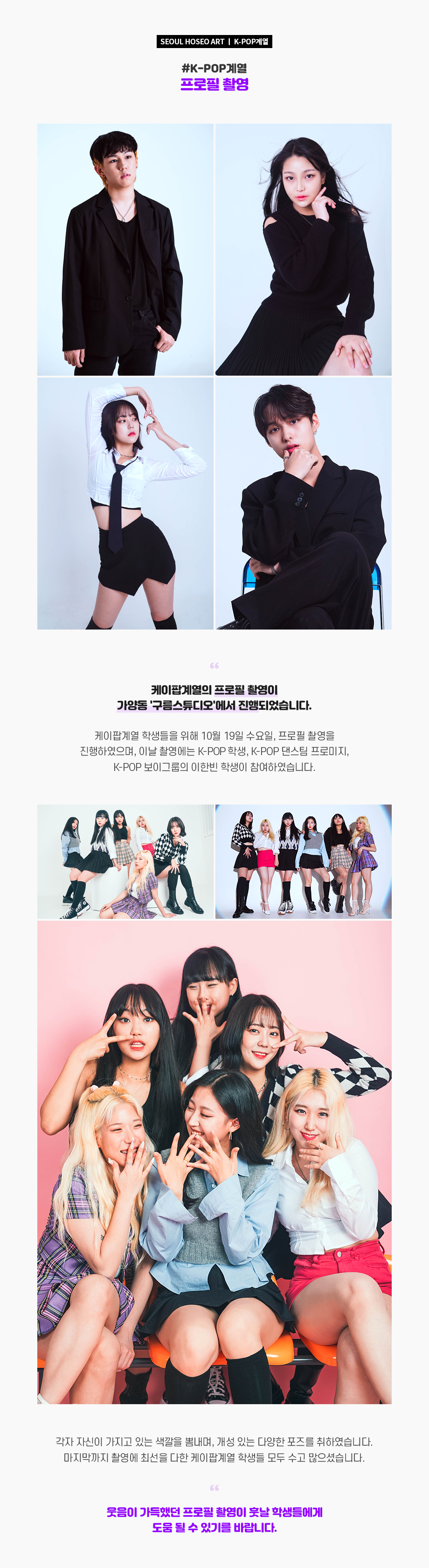 케이팝계열의 프로필 촬영이 가양동 '구름스튜디오'에서 진행되었습니다. 케이팝계열 학생들을 위해 10월 19일 수요일, 프로필 촬영을 진행하였으며, 이날 촬영에는 K-POP 학생, K-POP 댄스팀 프로미지, K-POP 보이그룹의 이한빈 학생이 참여하였습니다.