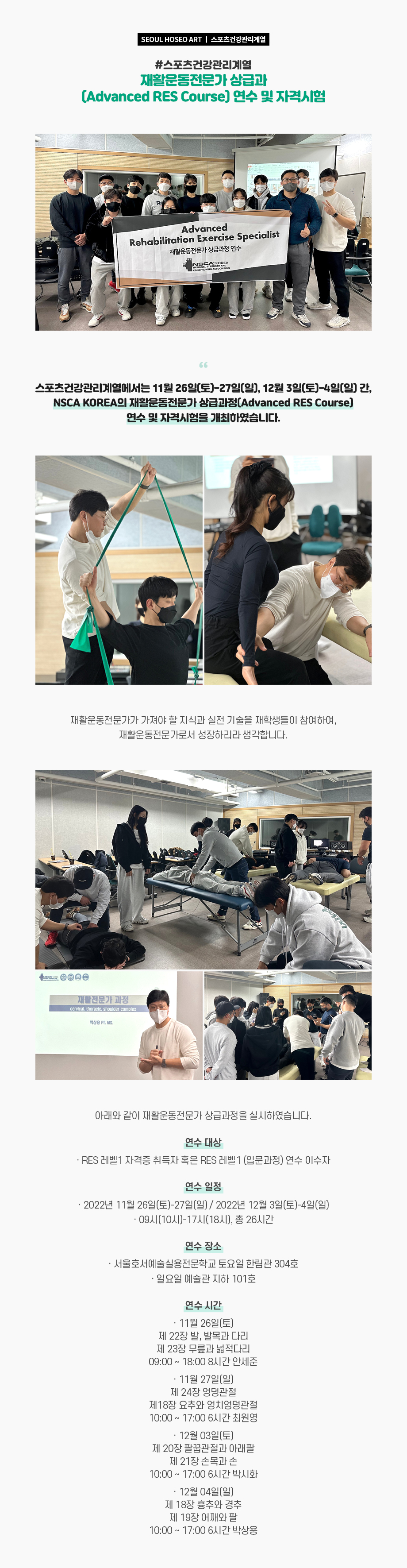 스포츠건강관리계열에서는 11월 26일(토)-27일(일), 12월 3일(토)-4일(일) 간, NSCA KOREA의 재활운동전문가 상급과정(Advanced RES Course) 연수 및 자격시험을 개최하였습니다. 재활운동전문가가 가져야 할 지식과 실전 기술을 재학생들이 참여하여, 재활운동전문가로서 성장하리라 생각합니다.