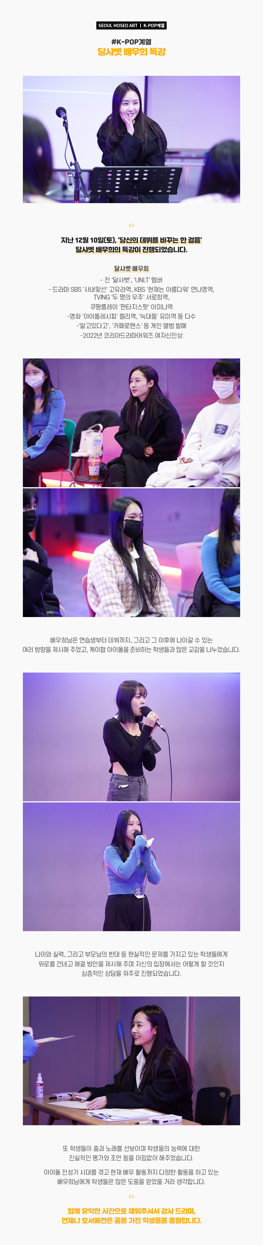 지난 12월 10일(토), '당신의 데뷔를 바꾸는 한 걸음' 달샤벳 배우희의 특강이 진행되었습니다. 배우희님은 연습생부터 데뷔까지, 그리고 그 이후에 나아갈 수 있는 여러 방향을 제시해 주었고, 케이팝 아이돌을 준비하는 학생들과 많은 교감을 나누었습니다.
