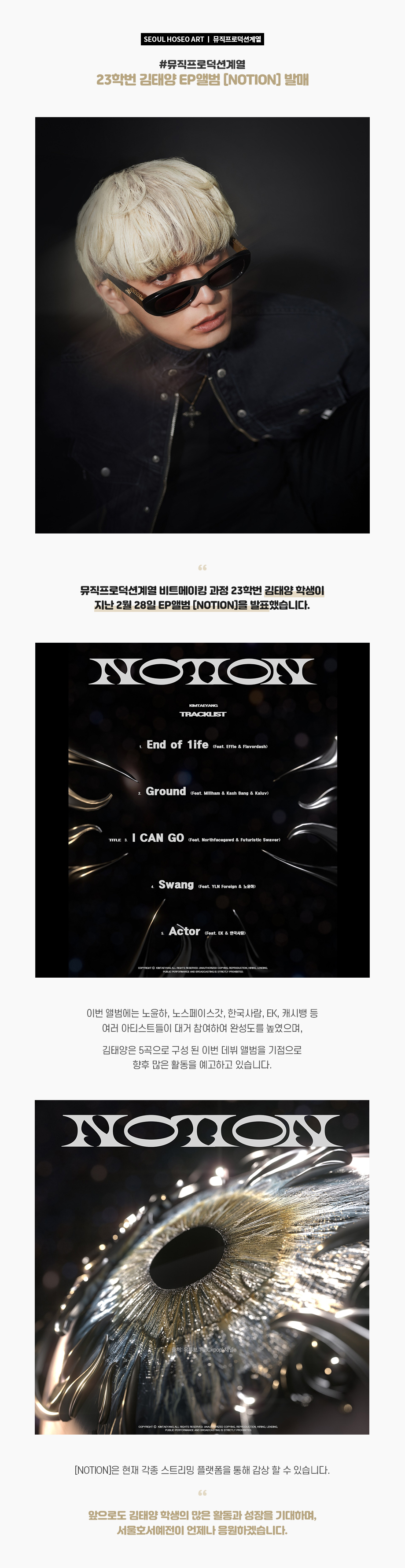 뮤직프로덕션계열 비트메이킹 과정 23학번 김태양 학생?이 지난 2월 28일 EP앨범 [NOTION]을 발표했습니다. 이번 앨범에는 노윤하, 노스페이스갓, 한국사람, EK, 캐시뱅 등 여러 아티스트들이 대거 참여하여 완성도를 높였으며 김태양은 5곡으로 구성 된 이번 데뷔 앨범을 기점으로 향후 많은 활동을 예고하고 있습니다.