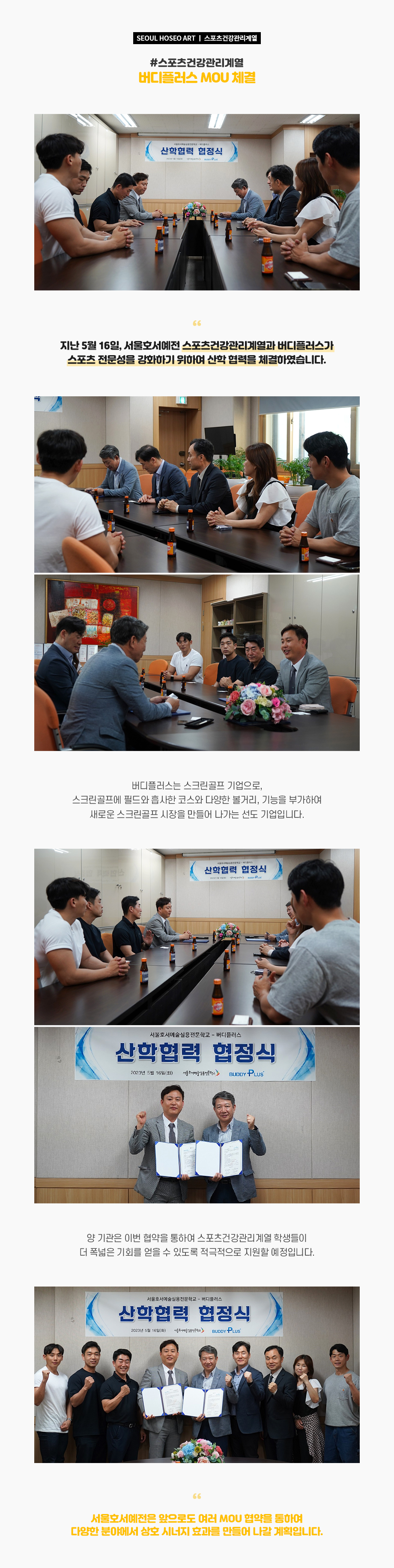 지난 5월 16일, 서울호서예전 스포츠건강관리계열과 버디플러스가 스포츠 전문성을 강화하기 위하여 산학 협력을 체결하였습니다. 버디플러스는 스크린골프 기업으로, 스크린골프에 필드와 흡사한 코스와 다양한 볼거리, 기능을 부가하여 새로운 스크린골프 시장을 만들어 나가는 선도 기업입니다.