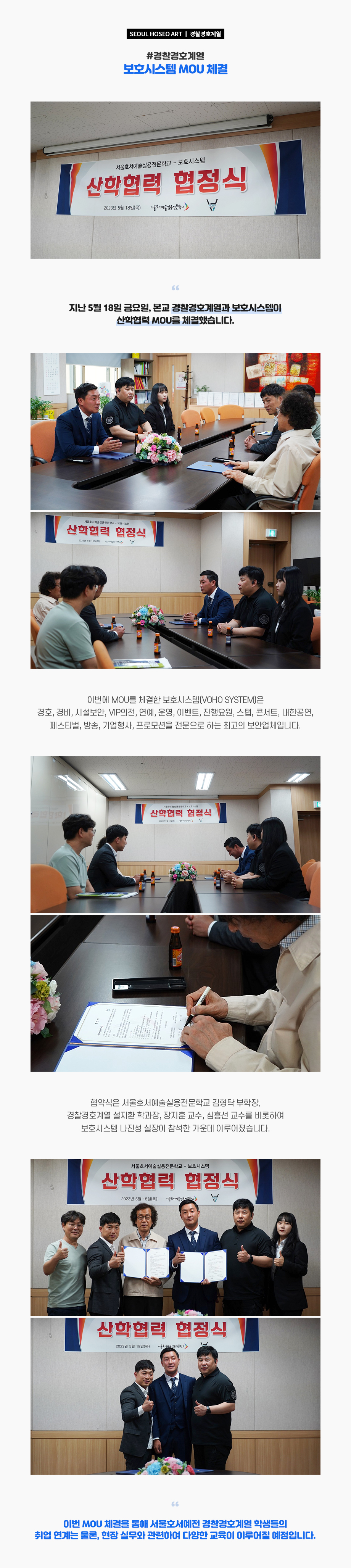 지난 5월 18일 금요일, 서울호서예술실용전문학교 경찰경호계열과 보호시스템이 산학협력 MOU를 체결했습니다. 이번에 MOU를 체결한 보호시스템(VOHO SYSTEM)은 경호, 경비, 시설보안, VIP의전, 연예, 운영, 이벤트, 진행요원, 스탭, 콘서트, 내한공연, 페스티벌, 방송, 기업행사, 프로모션을 전문으로 하는 최고의 보안업체입니다.