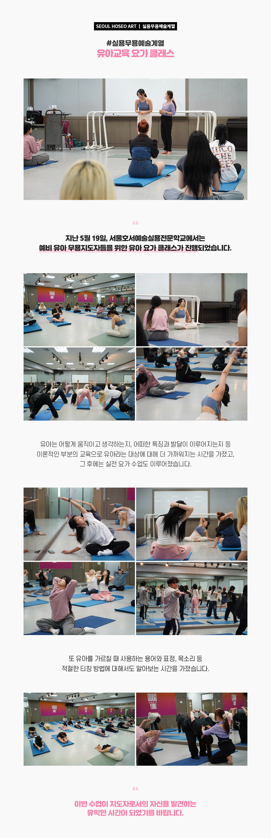 지난 5월 19일, 서울호서예술실용전문학교에서는 예비 유아 무용지도자들을 위한 유아 요가 클래스가 진행되었습니다. 유아는 어떻게 움직이고 생각하는지, 어떠한 특징과 발달이 이루어지는지 등 이론적인 부분의 교육으로 유아라는 대상에 대해 더 가까워지는 시간을 가졌고, 그 후에는 실전 요가 수업도 이루어졌습니다.