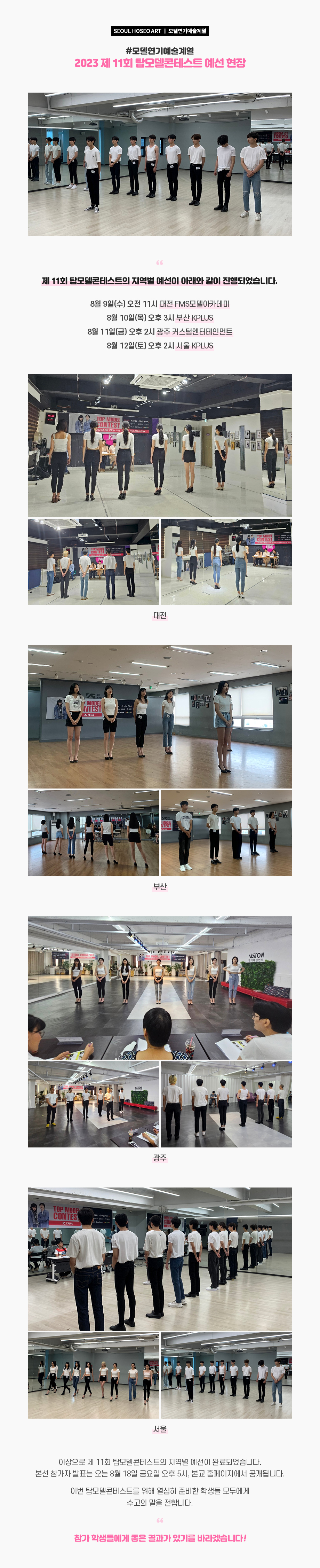 제 11회 탑모델콘테스트의 지역별 예선이 아래와 같이 진행되었습니다. 8월 9일(수) 오전 11시 대전 FMS모델아카데미 / 8월 10일(목) 오후 3시 부산 KPLUS / 8월 11일(금) 오후 2시 광주 커스텀엔터테인먼트 / 8월 12일(토) 오후 2시 서울 KPLUS