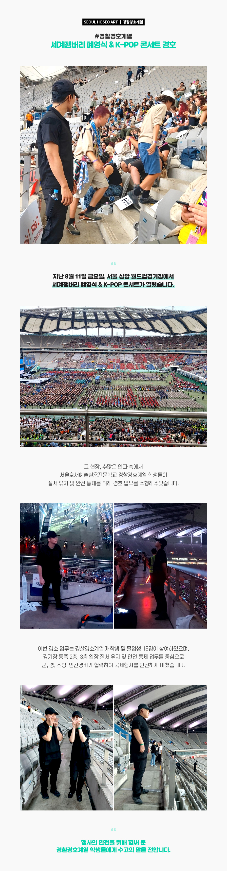 지난 8월 11일 금요일, 서울 상암 월드컵경기장에서 세계잼버리 폐영식 & K-POP 콘서트가 열렸습니다. 그 현장, 수많은 인파 속에서 서울호서예술실용전문학교 경찰경호계열 학생들이 질서 유지 및 안전 통제를 위해 경호 업무를 수행해주었습니다.