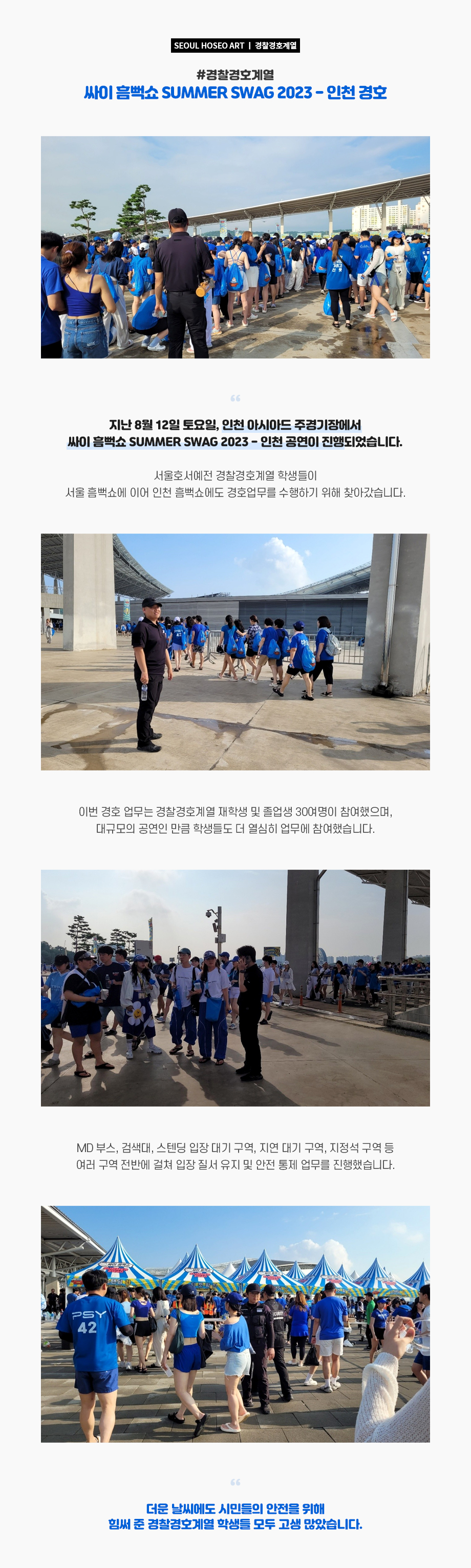 지난 8월 12일 토요일, 인천 아시아드 주경기장에서 싸이 흠뻑쇼 SUMMER SWAG 2023 - 인천 공연이 진행되었습니다. 서울호서예전 경찰경호계열 학생들이 서울 흠뻑쇼에 이어 인천 흠뻑쇼에도 경호업무를 수행하기 위해 찾아갔습니다.