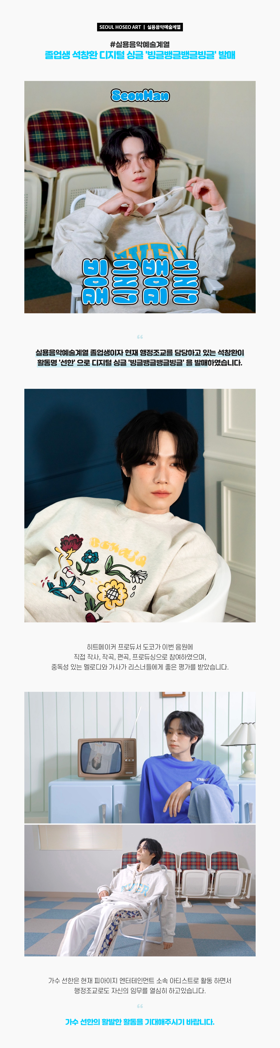 실용음악예술계열 졸업생이자 현재 행정조교를 담당하고 있는 석창환이 활동명 '선한' 으로 디지털 싱글 '빙글뱅글뱅글빙글' 을 발매하였습니다. 히트메이커 프로듀서 도코가 이번 음원에 직접 작사, 작곡, 편곡, 프로듀싱으로 참여하였으며, 중독성 있는 멜로디와 가사가 리스너들에게 좋은 평가를 받았습니다.