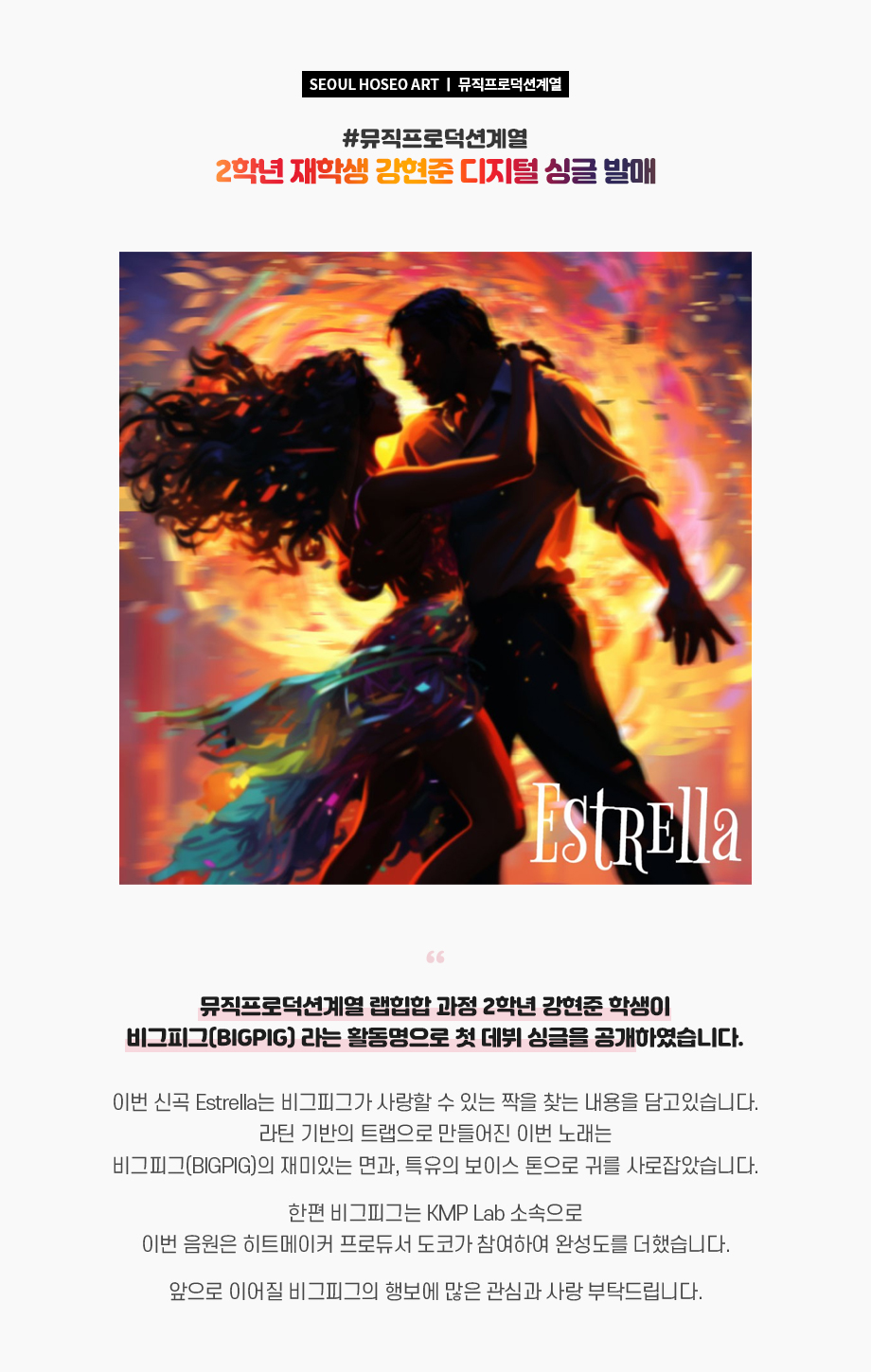 뮤직프로덕션계열 랩힙합 과정 2학년 강현준 학생이 비그피그(BIGPIG) 라는 활동명으로 첫 데뷔 싱글을 공개하였습니다. 이번 신곡 Estrella는 비그피그가 사랑할 수 있는 짝을 찾는 내용을 담고있습니다. 라틴 기반의 트랩으로 만들어진 이번 노래는 비그피그(BIGPIG)의 재미있는 면과, 특유의 보이스 톤으로 귀를 사로잡았습니다.
