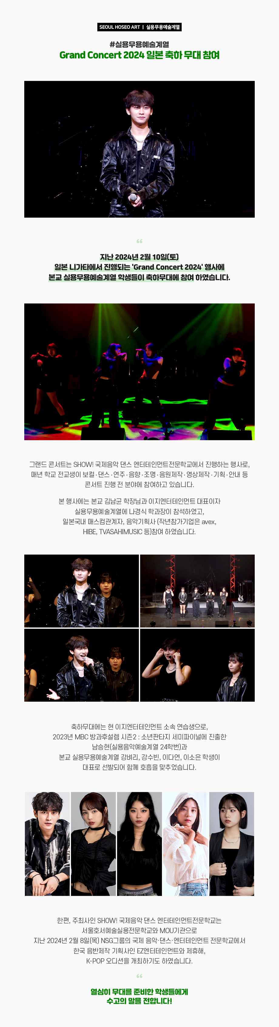 지난 2024년 2월 10일(토) 일본 니가타에서 진행되는 'Grand Concert 2024' 행사에 본교(서울호서예술실용전문학교) 실용무용예술계열 학생들이 축하무대에 참여 하였습니다. 그랜드 콘서트는 SHOW! 국제음악 댄스 엔터테인먼트전문학교에서 진행하는 행사로, 매년 학교 전교생이 보컬 · 댄스 · 연주 · 음향 · 조명 · 음원제작 · 영상제작 · 기획 · 안내 등 콘서트 진행 전 분야에 참여하고 있습니다. 본 행사에는 본교 김남균 학장님과, 이지엔터테인먼트 대표이자 실용무용예술계열에 나경식 학과장이 참석하였고, 일본국내 매스컴관계자,음악기획사 (작년참가기업은 avex, HIBE, TVASAHIMUSIC 등)참여 하였습니다.