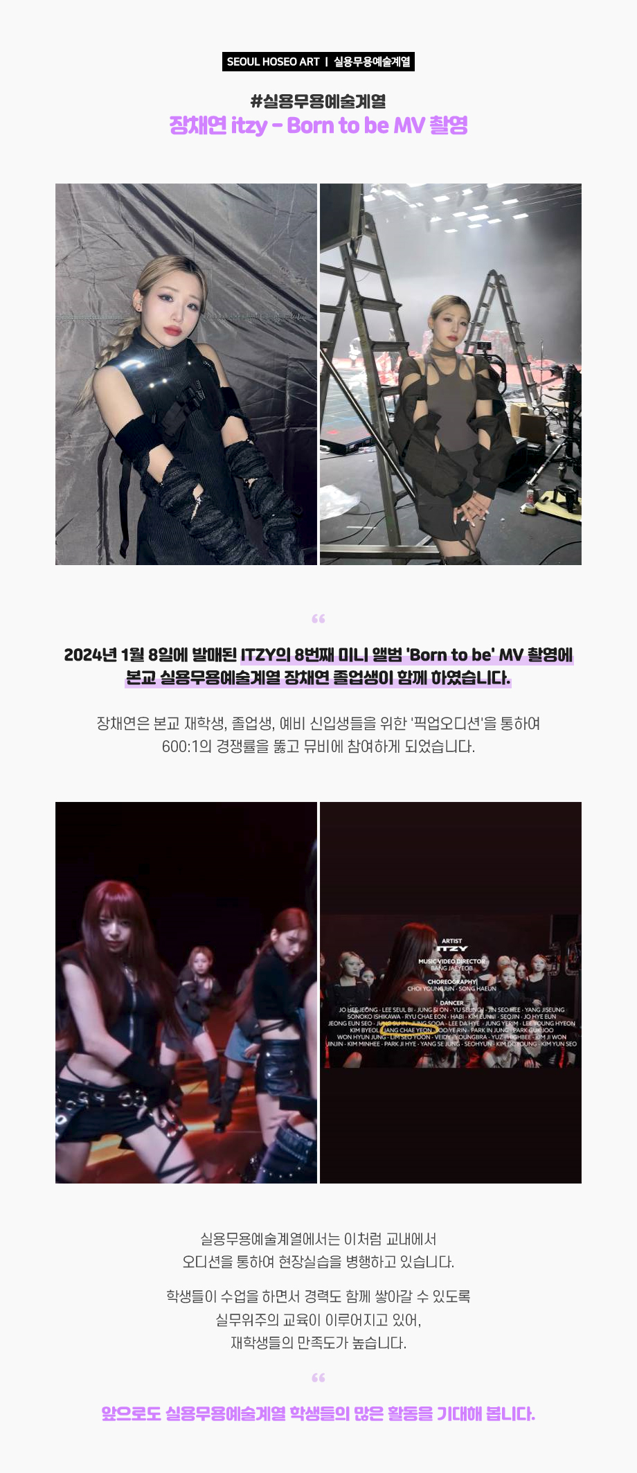 2024년 1월 8일에 발매된 ITZY의 8번째 미니 앨범 'Born to be' MV 촬영에 본교 실용무용예술계열 장채연 졸업생이 함께 하였습니다. 장채연은 본교 재학생, 졸업생, 예비 신입생들을 위한 '픽업오디션'을 통하여 600:1의 경쟁률을 뚫고 뮤비에 참여하게 되었습니다.
