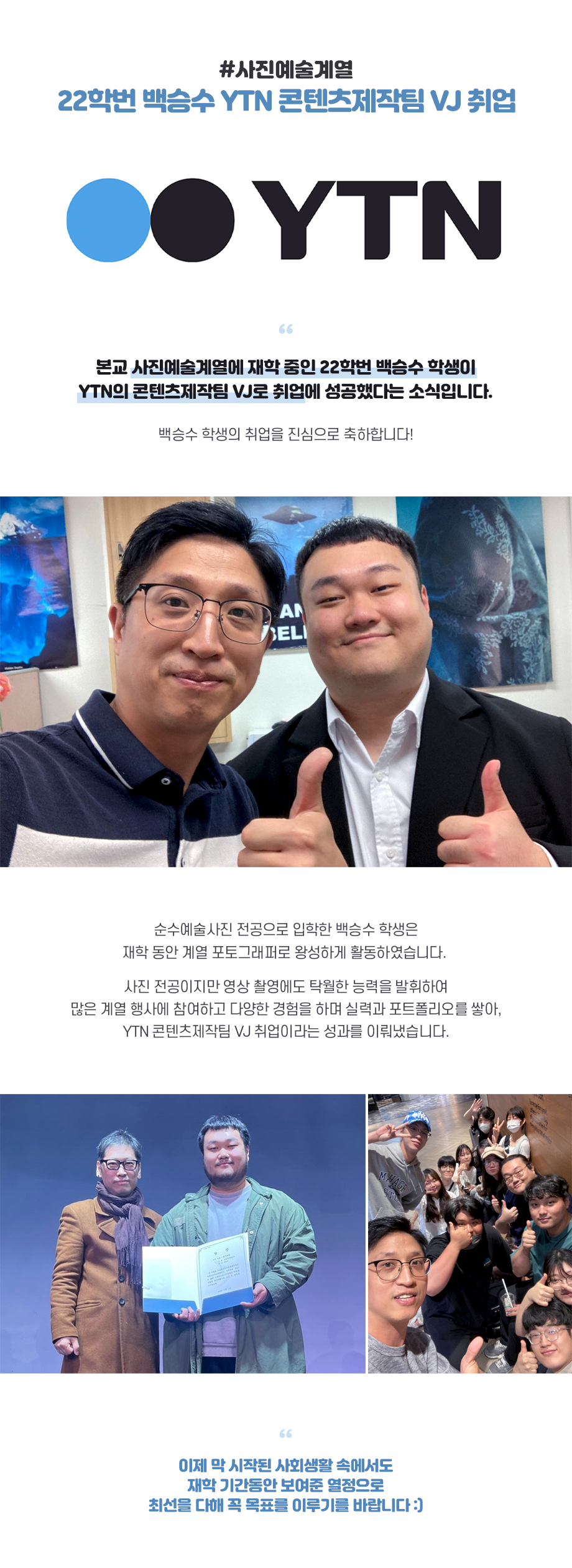 본교 사진예술계열에 재학 중인 22학번 백승수 학생이 YTN의 콘텐츠제작팀 VJ로 취업에 성공했다는 소식입니다. YTN 콘텐츠제작팀 VJ 취업을 진심으로 축하합니다!