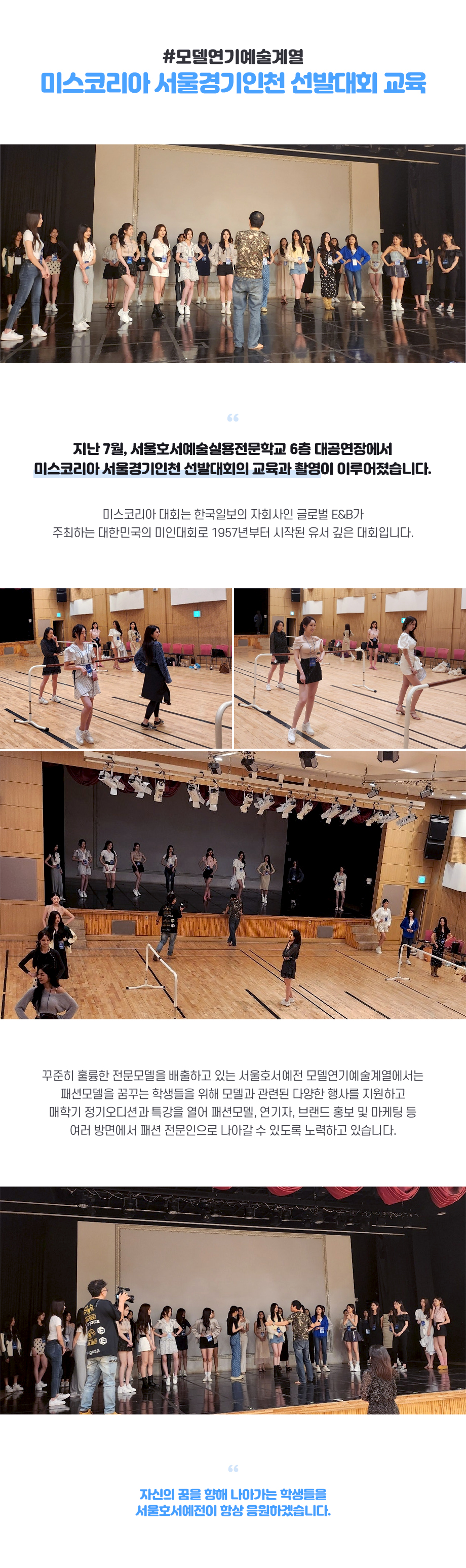 지난 7월, 서울호서예술실용전문학교 6층 대공연장에서 미스코리아 서울경기인천 선발대회의 교육과 촬영이 이루어졌습니다. 미스코리아 대회는 한국일보의 자회사인 글로벌 E&B가 주최하는 대한민국의 미인대회로 1957년부터 시작된 유서 깊은 대회입니다.