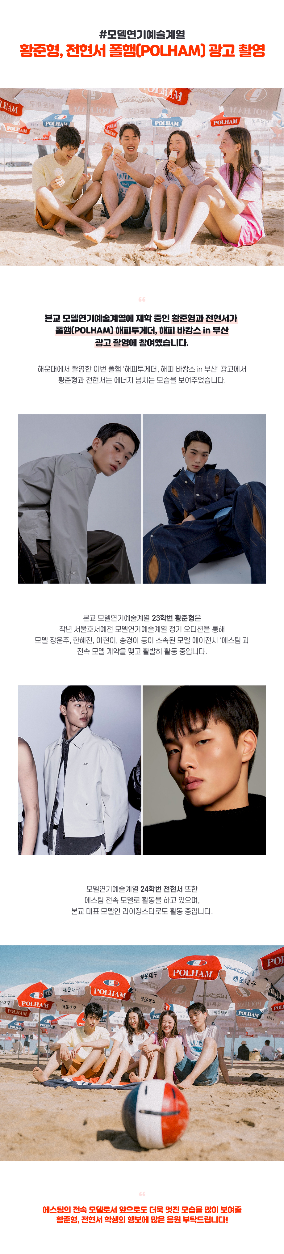 서울호서예술실용전문학교 모델연기예술계열에 재학 중인 황준형과 전현서가 폴햄(POLHAM) 해피투게더, 해피 바캉스 in 부산 광고 촬영에 참여했습니다. 해운대에서 촬영한 이번 폴햄 '해피투게더, 해피 바캉스 in 부산' 광고에서 황준형과 전현서는 에너지 넘치는 모습을 보여주었습니다.