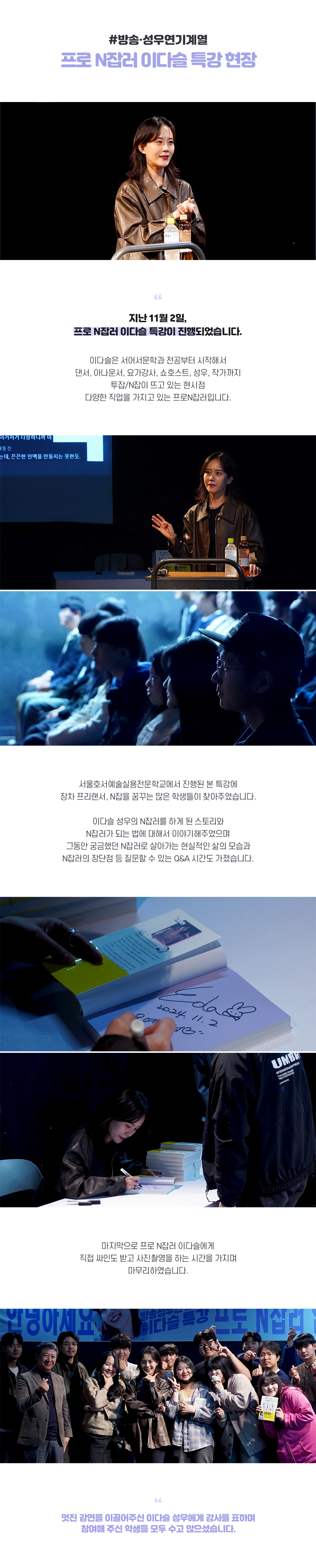 지난 11월 2일, 프로 N잡러 이다슬 특강이 진행되었습니다. 이다슬은 서어서문학과 전공부터 시작해서 댄서, 아나운서, 요가강사, 쇼호스트, 성우, 작가까지 투잡, N잡이 뜨고 있는 현시점 다양한 직업을 가지고 있는 프로N잡러입니다.