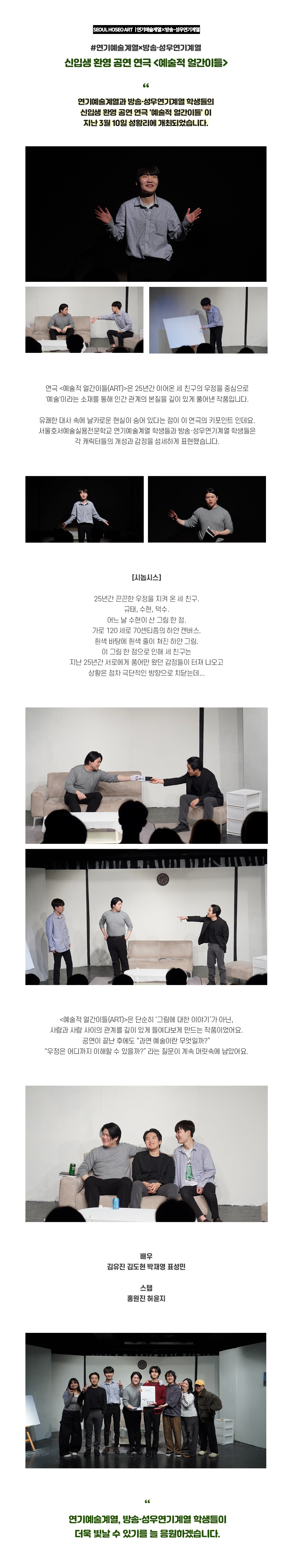 연기예술계열과 방송·성우연기계열 학생들의 신입생 환영 공연 연극 '예술적 얼간이들' 이 지난 3월 10일 성황리에 개최되었습니다.
