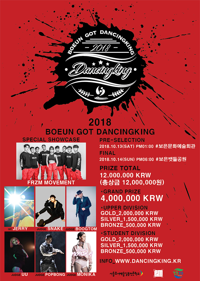 서울호서예술실용전문학교에서 후원하는 2018 보은 갓 댄싱킹이 오는 2018년 10월 13일(토) 예선을 시작으로 10월 14일(일) 본선이 개최됩니다.