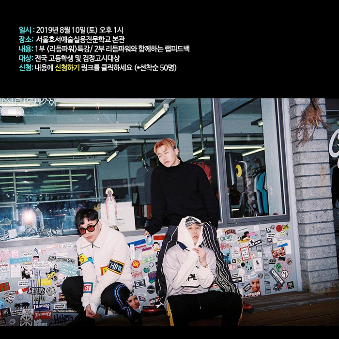 오는 8월 10일 오후 1시 본교 예술관 대강당에서 힙합 뮤지션 '리듬파워'의 무료특강 및 랩피드백이 아래와 같이 실시됩니다.