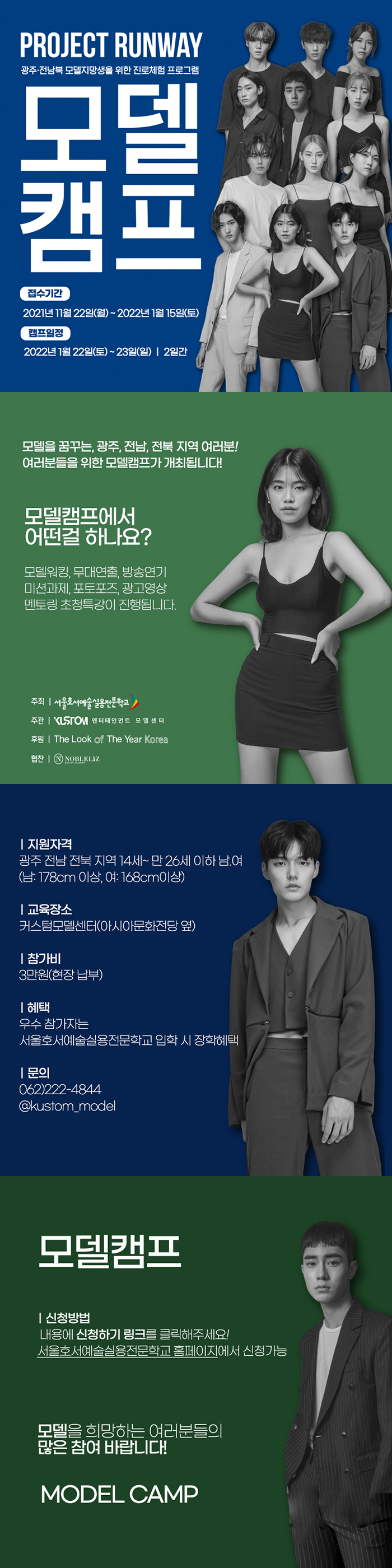 광주, 전남, 전북 지역 모델지망생을 위한 2021 PROJECT RUNWAY 모델캠프가 진행될 예정입니다.
