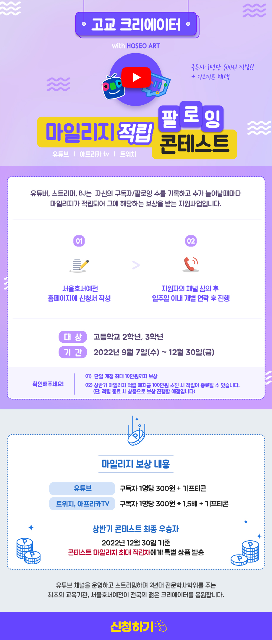 서울호서예술실용전문학교 유튜브제작계열 2022 고교 크리에이터 마일리지 적립 팔로잉 콘테스트 신청하기