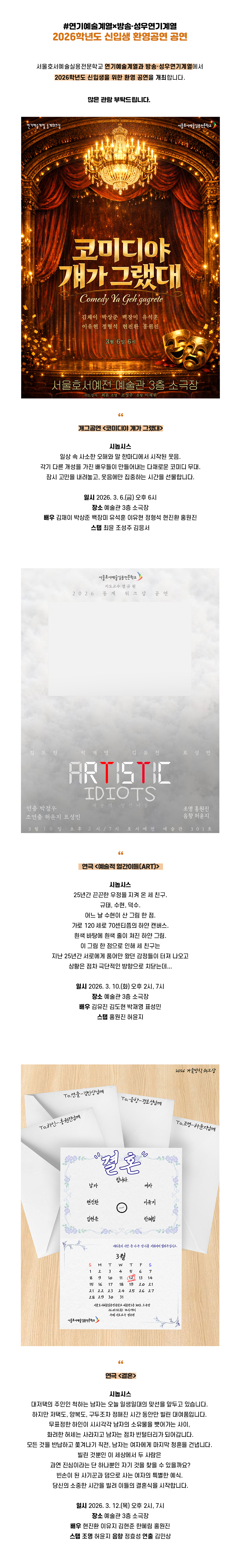 서울호서예술실용전문학교 연기예술계열과 방송·성우연기계열에서 2026학년도 신입생을 위한 환영 공연을 개최합니다.