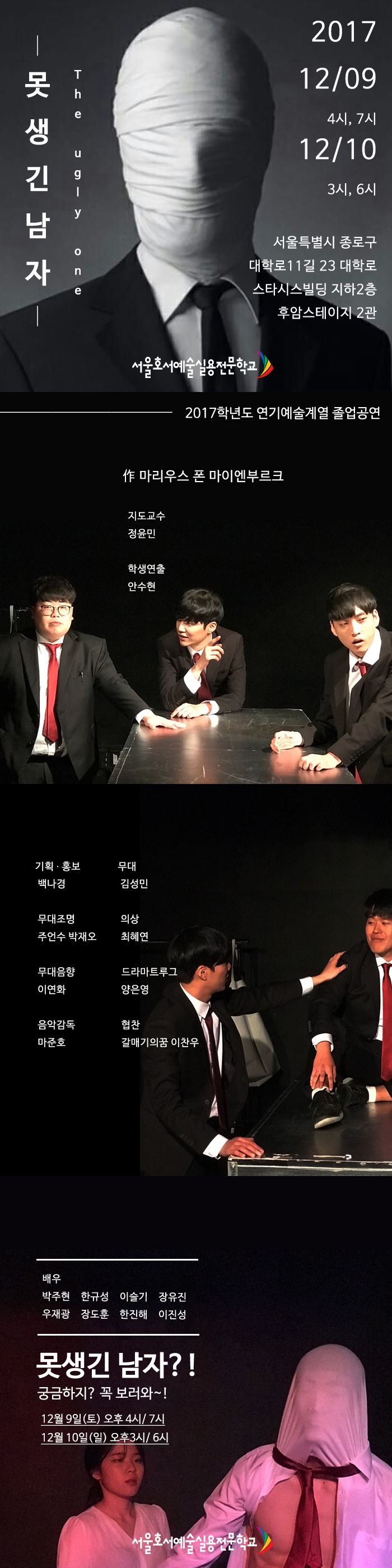 졸업공연 <못생긴남자> 공연이 오는 12월 9일(토) 오후4시, 7시, 12월10일(일) 오후3시 6시에 대학로 스타시스 빌딩 지하2층 후암스테이지 2관에서 아래와 같이 개최됩니다.