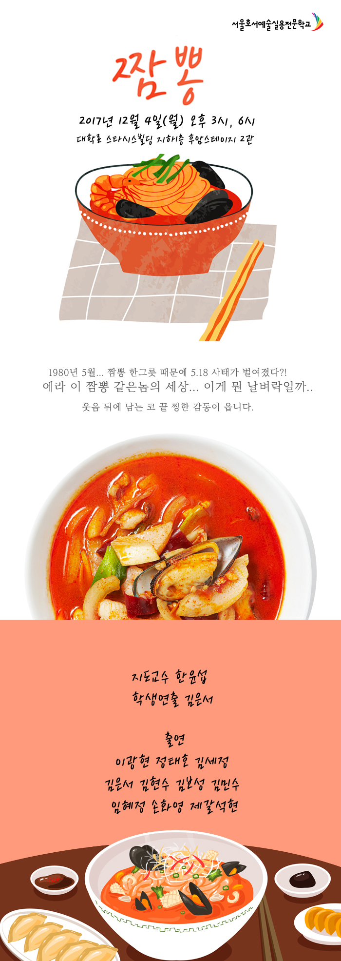 졸업공연 <짬뽕> 공연이 오는 12월 4일(월) 오후3시, 6시에 대학로 스타시스 빌딩 지하1층 후암스테이지 2관에서 아래와 같이 개최됩니다.