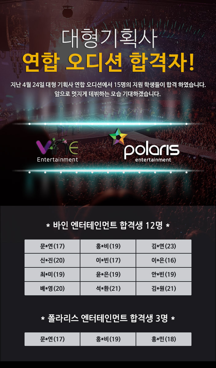 지난 4월 24일 대형 기획사 연합 오디션에서 15명의 지원 학생들이 엔터테인먼트에 합격을 하였습니다.