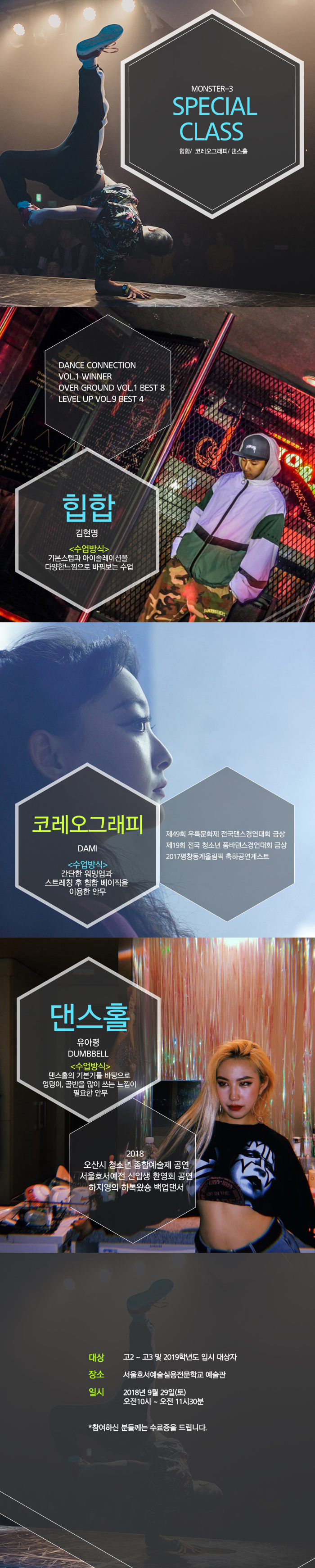 실용무용 스페셜 체험학교가 오는 9월 29일(토) 오전 10시에 힙합, 코레오그래피, 댄스홀 과정으로 구성되어 진행합니다. 참여하신 분들께 수료증을 드립니다. 춤에 관심있는 청소년들의 많은 참여 바랍니다.