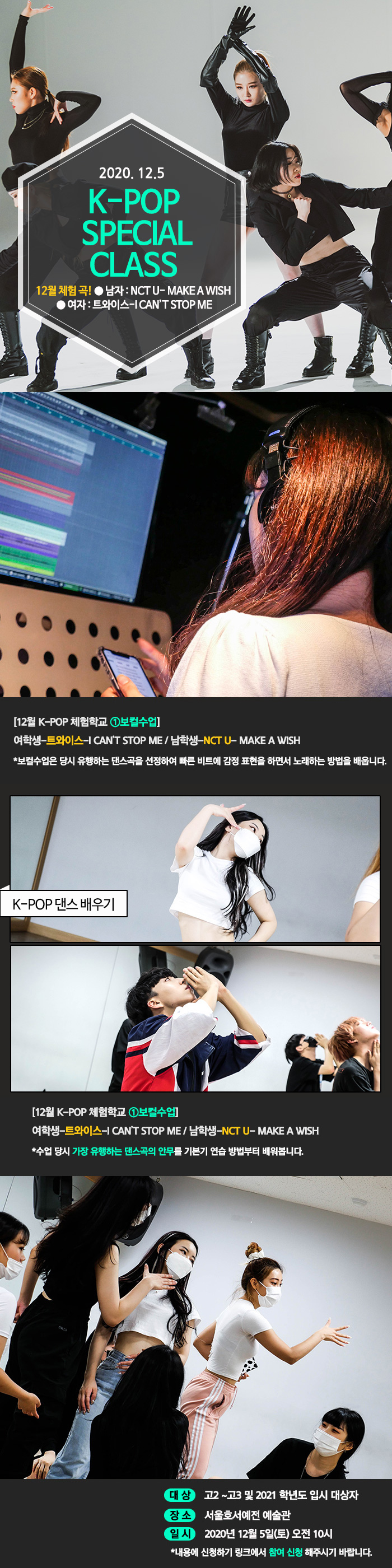 12월 케이팝 체험학교는 여학생-트와이스-I CAN’T STOP ME / 남학생-NCT U- MAKE A WISH 곡으로 진행됩니다.