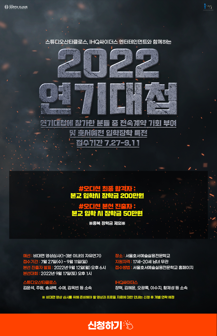 서울호서예술실용전문학교 연기예술계열 스튜디오산타클로스, IHQ싸이더스 엔터테인먼트와 함께하는 2022 연기대첩 신청하기