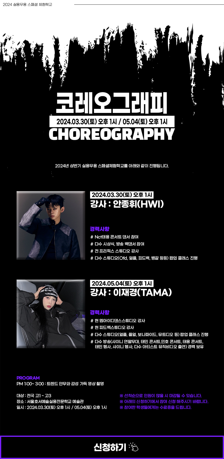 서울호서예술실용전문학교 실용무용예술계열 2024 실용무용 스페셜 체험학교 코레오그래피[CHOREOGRAPHY] 신청하기