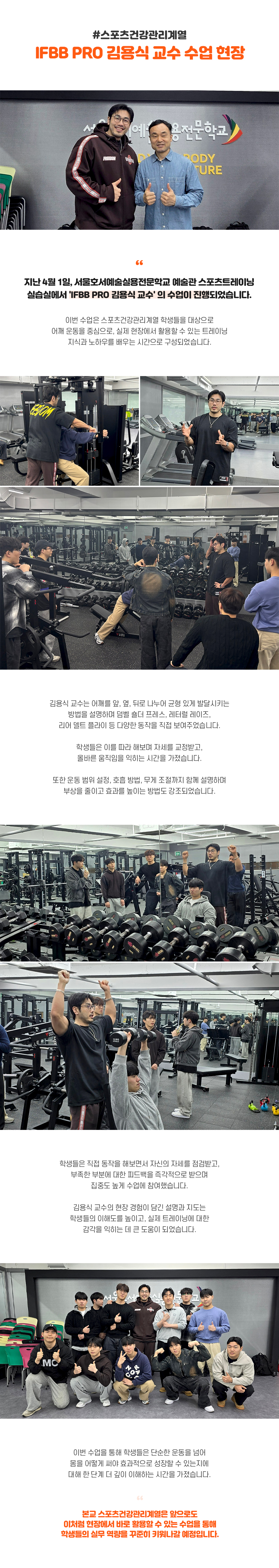 지난 4월 1일, 서울호서예술실용전문학교 예술관 스포츠트레이닝 실습실에서 'IFBB PRO 김용식 교수' 의 수업이 진행되었습니다.