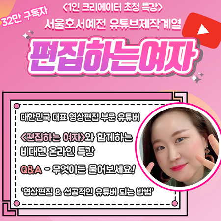 [언론보도]서울호서예전 유튜브제작, ‘편집하는 여자’ 유튜버 비대면 특강서울호서예술실용전문학교(이하 서울호서예전) 방송영화제작계열 및 유튜브제작계열에서 오는 22일 영상편집 부문 최고의 유튜버 32만 구독자가 인정한 ‘편집하는 여자’의 비대면 온라인 특강을 개최한다. 이번 특강은 '영상편집&성공적인 유튜버 되는 방법'이라는 주제와 Q&A로 진행된다. 이번 특강 신청