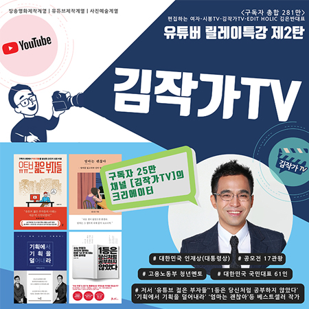 [언론보도]‘김작가TV’ 유튜버 릴레이 특강 2탄 개최서울호서예술실용전문학교(이하 서울호서예전) 방송영화제작계열 및 유튜브제작계열 과정이 2020년도 1학기 유튜버 릴레이 특강 제2탄으로 구독자 25만 유튜브 채널 <김작가TV>의 크리에이터 김도윤 작가의 특강을 29일 교내 스튜디오실에서 진행한다고 밝혔다. 참가 희망을 원하는 고등학생은 해당 학교 홈페이지에서 무료로 신청 가능하다. 이번