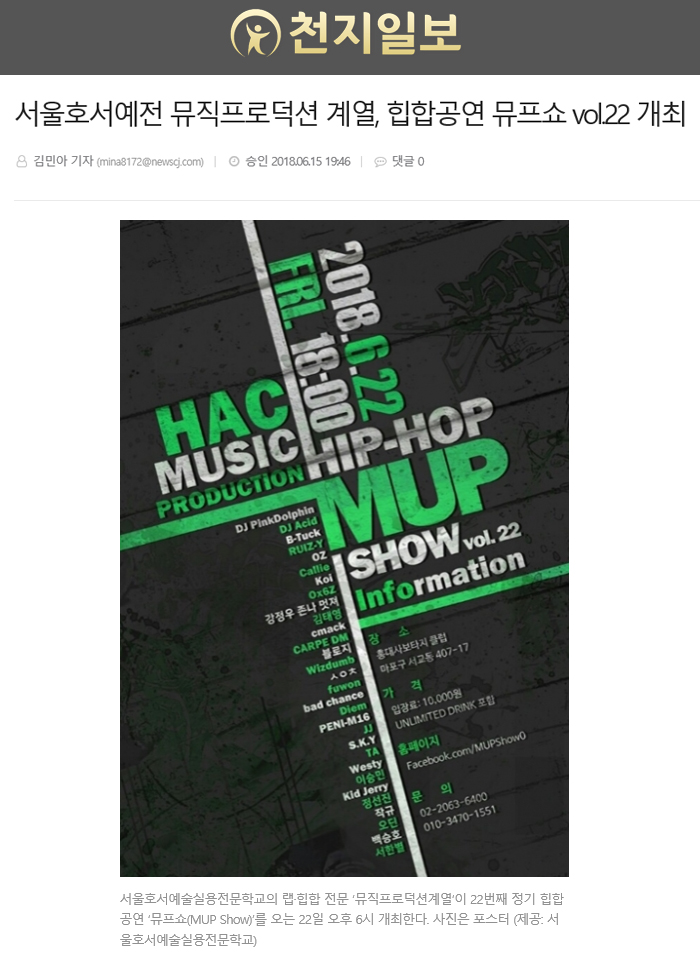 [천지일보=김민아 기자] 서울호서예술실용전문학교(서울호서예전)의 랩·힙합 전문 ‘뮤직프로덕션계열’이 22번째 정기 힙합공연 ‘뮤프쇼(MUP Show)’를 개최한다.